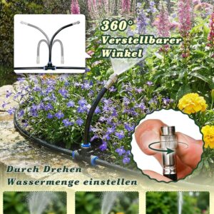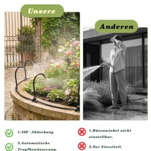 Eine automatische Bewässerung spart Zeit und stellt sicher, dass Pflanzen auch bei Abwesenheit konstant mit Feuchtigkeit versorgt werden. Durch die 360°-Ausrichtung der Sprühköpfe findet eine effiziente Verteilung statt, die besonders bei komplexen Gartenstrukturen vorteilhaft ist. Nutzer bewerten dieses System mit 5,0 Sternen für seine hohe Anpassungsfähigkeit.