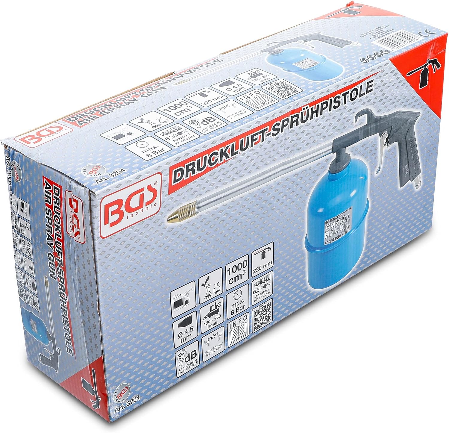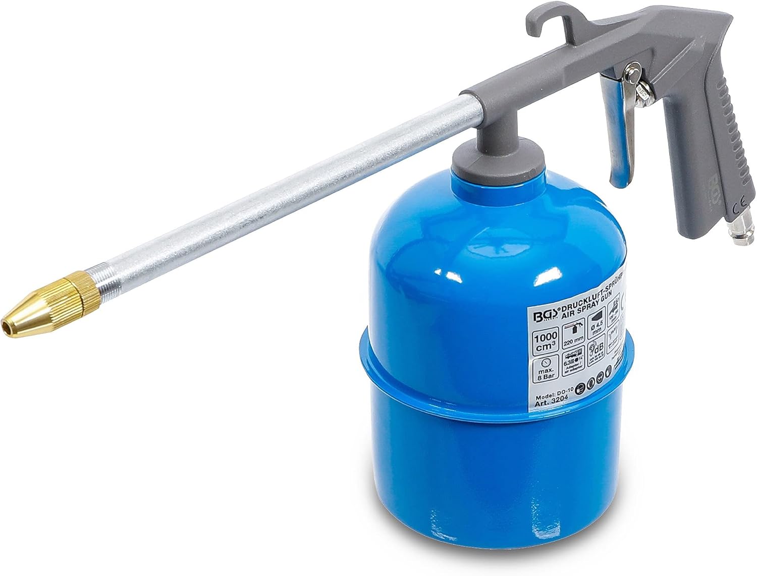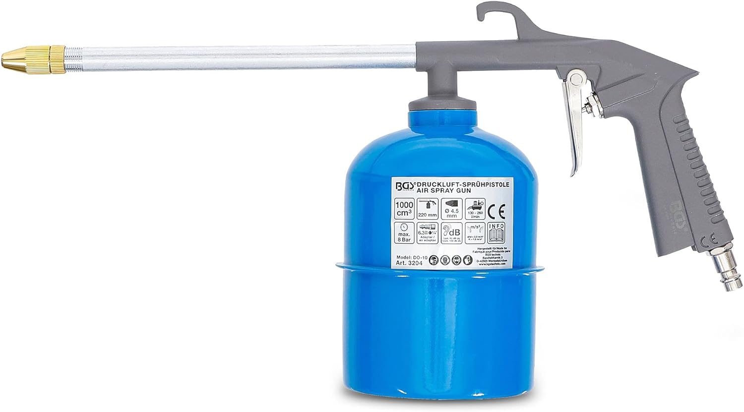 Die BGS 3204 Druckluft-Sprühpistole ist die ideale Lösung für Profis und ambitionierte Hobby-Schrauber, die Reinigungs- oder Lösemittel effizient und großflächig applizieren müssen. Dank des großzügigen 1000 cm³ Behälters arbeitest du bei Reinigungsaufgaben in der Werkstatt oder bei Entfettungsvorgängen ohne ständige Unterbrechungen durch Nachfüllen.