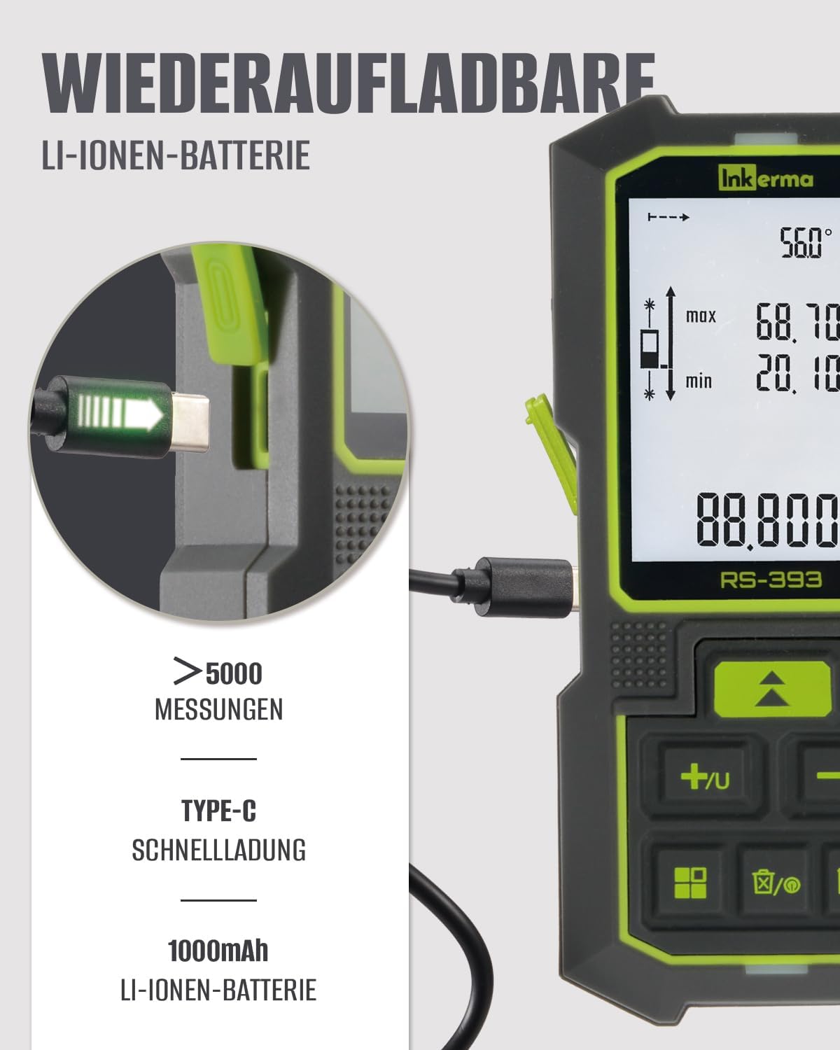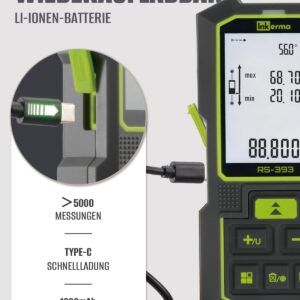 - Lange Akkulaufzeit: Der Lithium-Akku reicht für über 5000 Messungen pro Ladezyklus, was ausgiebige Arbeitstage ohne Unterbrechung ermöglicht.