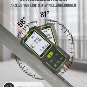 Das Gerät ist mit einer praktischen Neigungswinkelfunktion ausgestattet, die es ermöglicht, Winkel in verschiedenen Ausrichtungen präzise zu erfassen. Dies erleichtert die tägliche Arbeit bei komplexen Messungen erheblich und trägt zu einer höheren Genauigkeit bei.