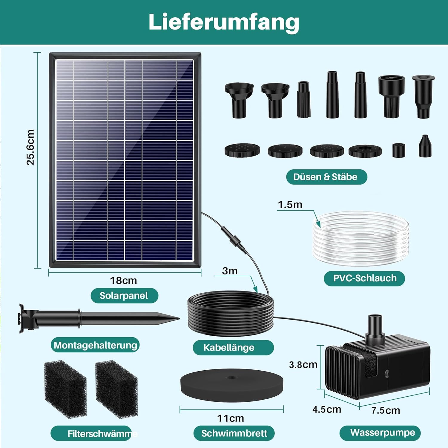 - Solarpanel, Wasserpumpe, Wasserschläuche, 8 Düsen, Filter