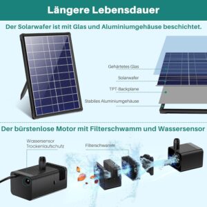 - Hochwertige Solar-Technik: 8W Glas-Solarpanel mit 3 Meter Kabel für optimale Sonnenausbeute, leiser Betrieb unter 50 dB und energieeffizienter Betrieb für 150-500 Liter Teiche. Das witterungsbeständige Panel liefert zuverlässig Energie für dauerhaften Betrieb