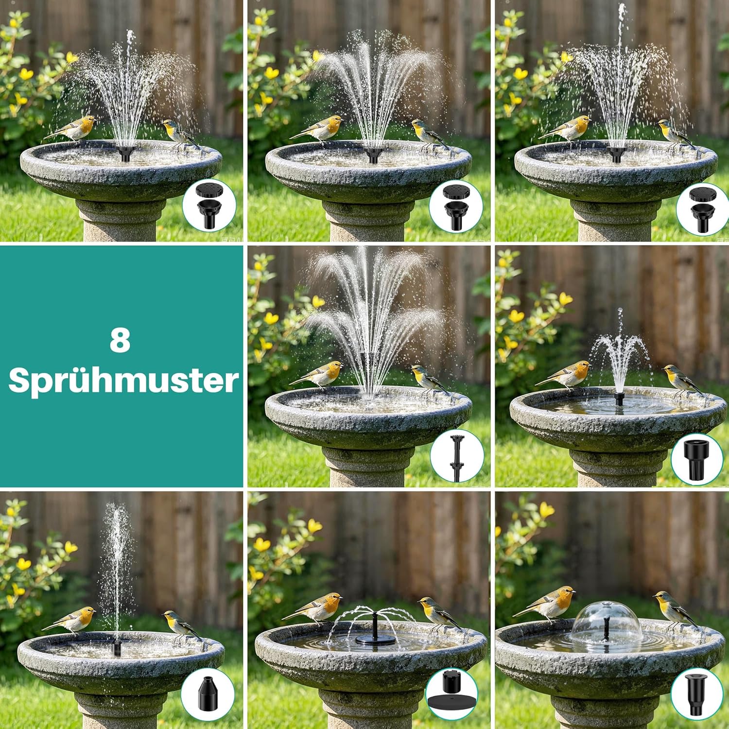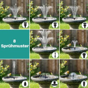 - Vielseitige Wasserspiele: 8 verschiedene Düsen ermöglichen individuelle Fontänen von 0,5-0,8 Meter Höhe, mit praktischem Schlauch und Durchflussregler für kreative Gestaltung. Wechseln Sie mühelos zwischen verschiedenen Wasserbildern und schaffen Sie einzigartige Wassereffekte in Ihrem Garten