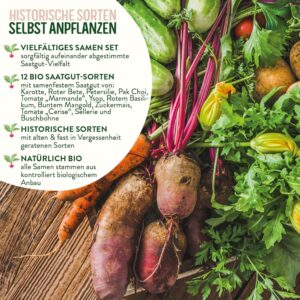 Dieses BIO Historisches Gemüse Samen Set richtet sich an Hobbygärtner und Selbstversorger, die Wert auf Sortenvielfalt abseits des Supermarkt-Sortiments legen. Mit 12 samenfesten Gemüsesorten holst du dir historsiche Vielfalt direkt ins Beet oder auf den Balkon.