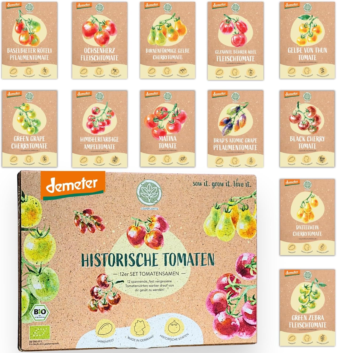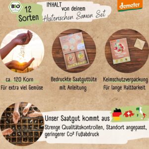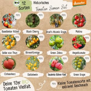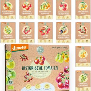 Das Set beinhaltet 12 verschiedene historische Tomatensorten in BIO-Qualität. Diese Auswahl bietet eine besondere Vielfalt für Ihren Garten, wobei die genauen Sortennamen meist direkt auf den beiliegenden Saatguttüten vermerkt sind.