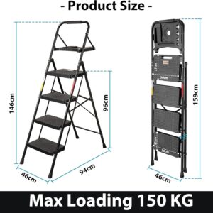 Die BONTEC Trittleiter verfügt über eine hohe Tragfähigkeit von bis zu 150 kg. Dies wird durch die robuste Konstruktion aus verdickten Stahlrohren sowie speziell verbreiterte Pedale ermöglicht.