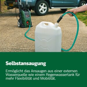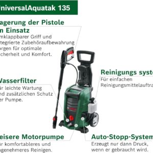- Lieferumfang: UniversalAquatak 135, Bosch Hochdruckpistole, 7 m Schlauch, 3-in-1-Düse, Hochdruck-Schaumdüse mit Behälter, transparenter Wasserfilter