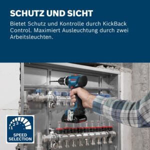 - KickBack Control aktivieren: Bei Bohrungen über 8 mm in Metall oder bei Lochsägen immer die Sicherheitsfunktion einschalten
