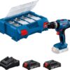 - Lieferumfang Amazon Exclusive: GSB 18V-21, 2×2,0 Ah Akku, 40-teiliges Zubehörset, Ladegerät GAL 18V-40, L-BOXX 136