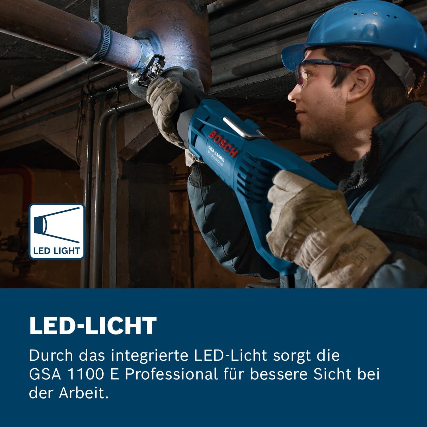 Die Bosch Professional GSA 1100 E verbindet kompakte Bauweise mit professioneller Leistung. Der 1100-Watt-Motor liefert konstante Kraft für den Hubantrieb, wodurch das Sägeblatt auch bei härteren Materialien nicht abbremst. Die Hubzahl lässt sich stufenlos regulieren, was beim Anschnitt empfindlicher Materialien oder beim präzisen Arbeiten an Rohrleitungen wichtig ist.