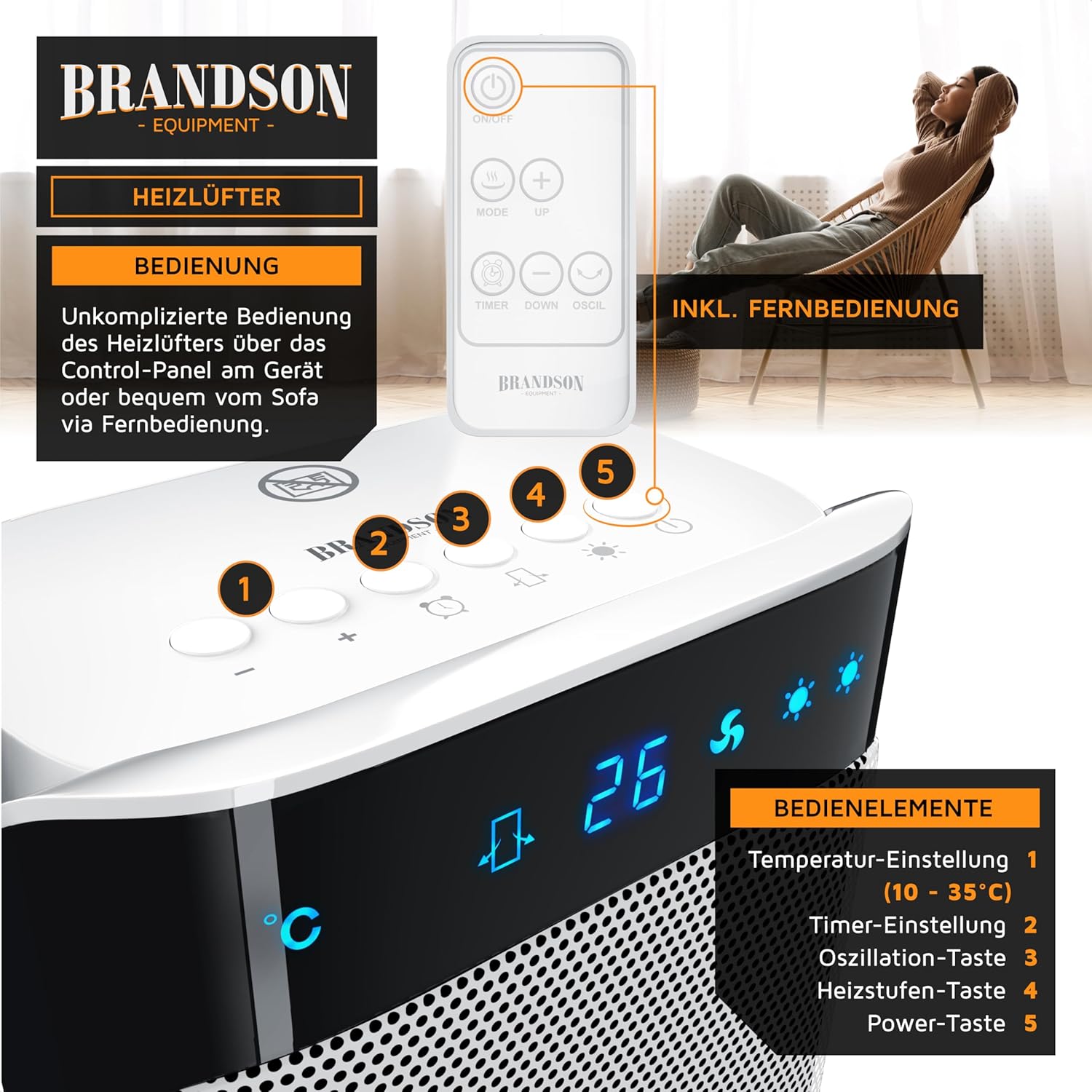 Brandson – Heizlüfter 2000 Watt mit Fernbedienung – Groß und Stark – Preisträger – energiesparend leise – Bad Wohnzimmer Kinderzimmer Babys – Oszillationsfunktion – Heizung Heater – GS zertifiziert