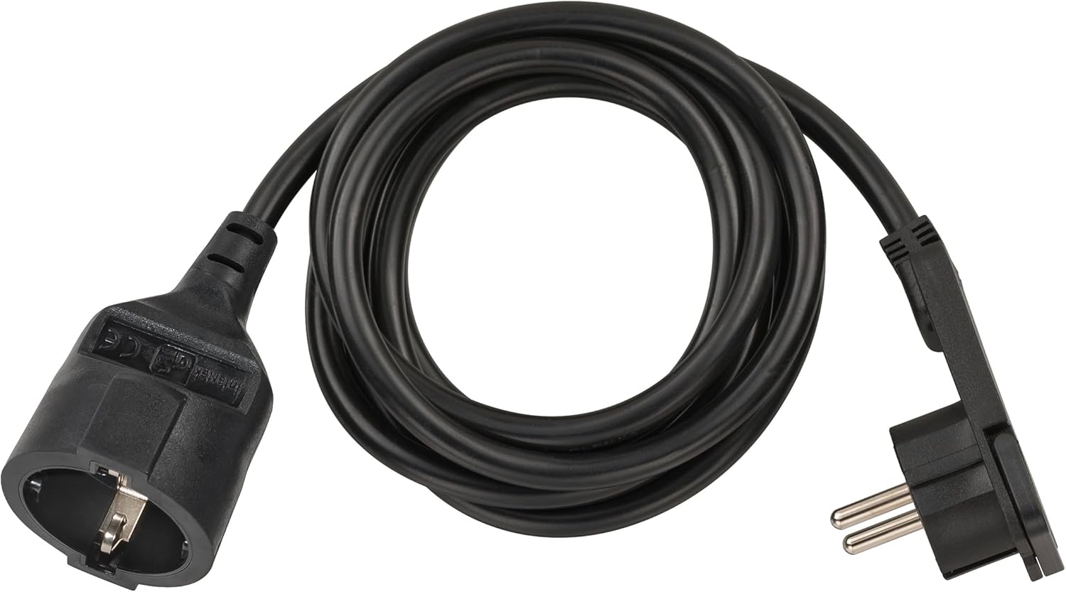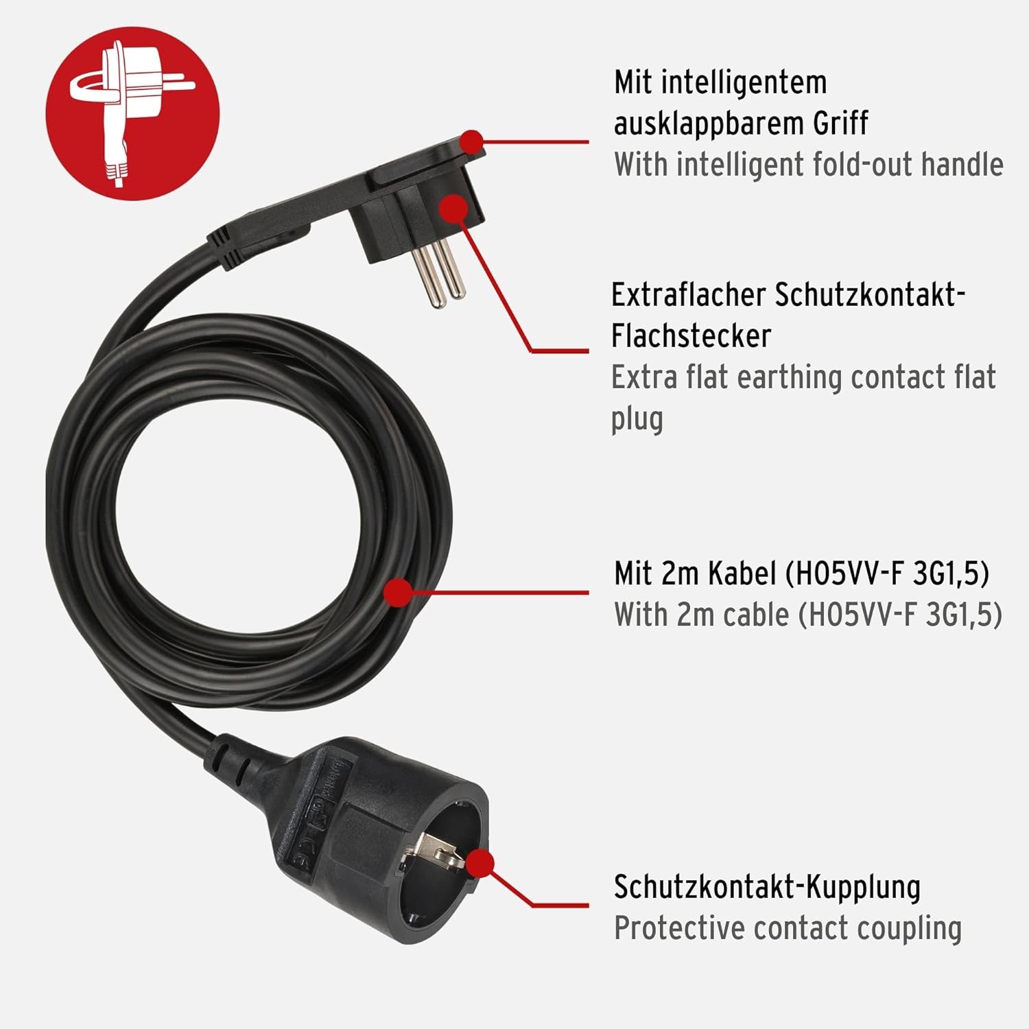 Das Kabel ist mit einem extraflachen Schutzkontakt-Winkelstecker ausgestattet, der besonders platzsparend hinter Möbelstücken oder in engen Ecken einsetzbar ist. Die Schutzkontakt-Kupplung besteht zudem aus robustem Kunststoff, was für eine langlebige Anwendung sorgt.