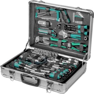 Brüder Mannesmann Werkzeugkoffer, 124-teilig, aus Aluminium - Werkzeugsatz mit Schraubendrehern, Zangen, Bitsatz, Steckschlüsselsatz, Säge und mehr - Werkzeug aus Chrom-Vanadium-Stahl | M29072