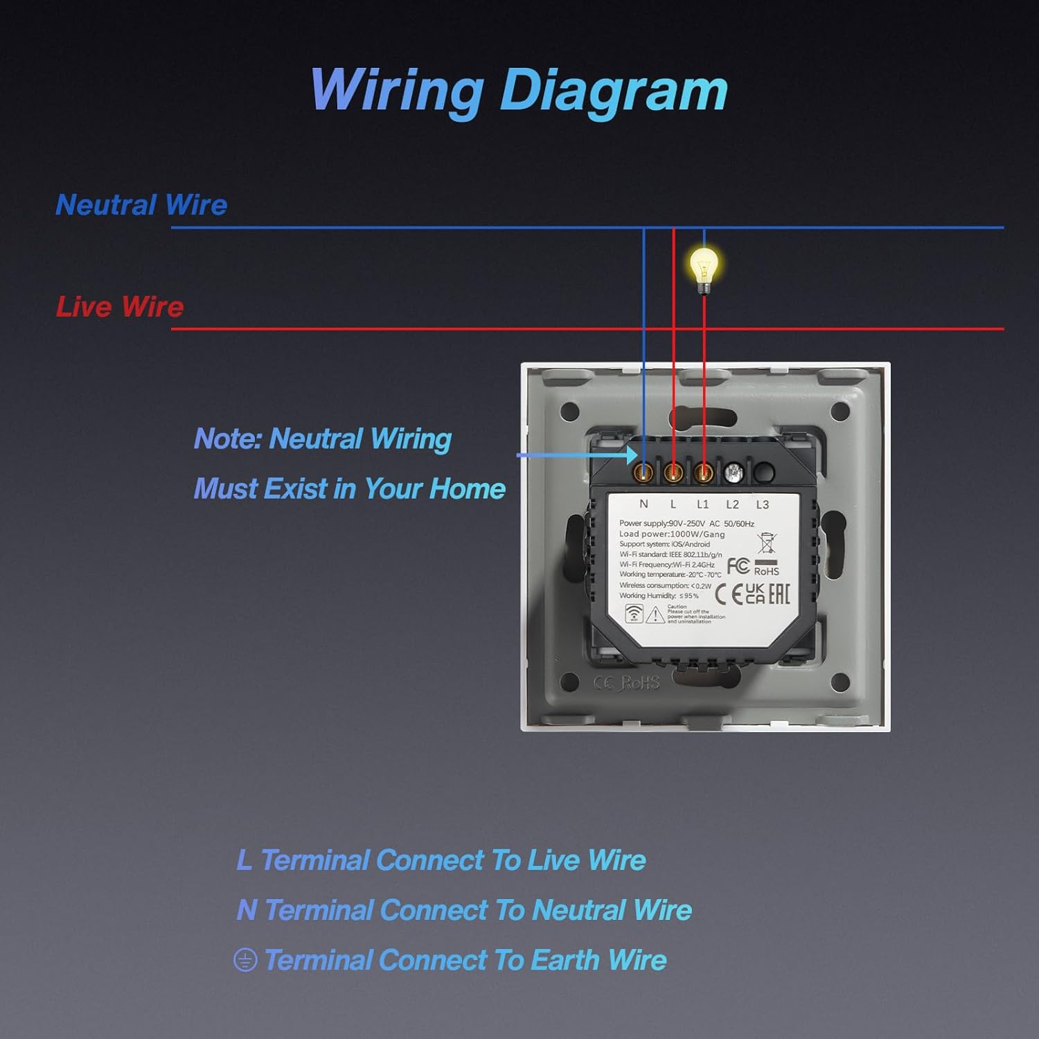 Der BSEED WLAN Smart Touch Lichtschalter verbindet klassische Elektroinstallation mit moderner Vernetzbarkeit. Das Herzstück bildet das kapazitive Touch-Panel, das auf Impulse reagiert und eine intuitive Bedienung ermöglicht. Technisch ist der Schalter auf maximale Kompatibilität innerhalb des Tuya-Ökosystems ausgelegt. Bitte beachte zwingend, dass für den Betrieb ein Neutralleiter (N-Leiter) in der Unterputzdose vorhanden sein muss. Sollte dieser in alten Bestandsbauten fehlen, ist eine fachgerechte Nachrüstung durch einen Elektriker erforderlich, da das Modul für den Standby-Betrieb eine permanente Stromversorgung benötigt.