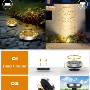 Die Installation ist sehr einfach und erfolgt ohne Verkabelung in zwei Varianten. Für harte Oberflächen schrauben Sie die verdeckte Schnalle an und drehen die Leuchte auf Holzboden oder Beton fest. Für weiche Böden befestigen Sie den mitgelieferten Erdspieß an der Klammer und stecken ihn in den Boden – wichtig ist, vorher den Schalter auf „ON“ zu stellen.