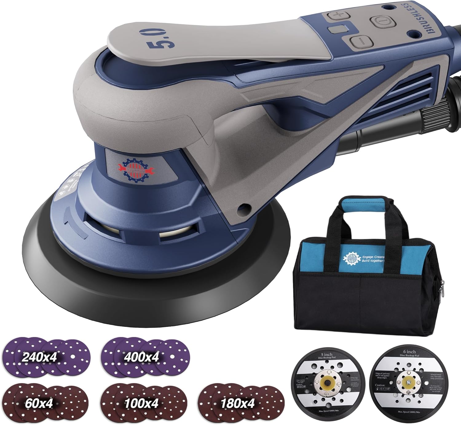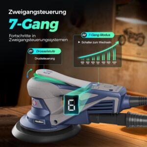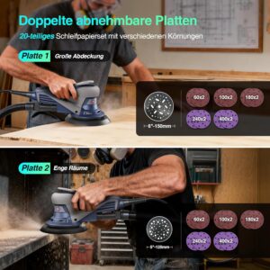 Bürstenloser Exzenterschleifer mit 125mm/150mm Schleifteller, 350W Schleifmaschine für Holz mit 20 Schleifpapier, 7-Stufiger Drehzahlregelung bis 10.000 U/min, TragkofferBürstenloser Exzenterschleifer mit 125mm/150mm Schleifteller, 350W Schleifmaschine für Holz mit 20 Schleifpapier, 7-Stufiger Drehzahlregelung bis 10.000 U/min, Tragkoffer