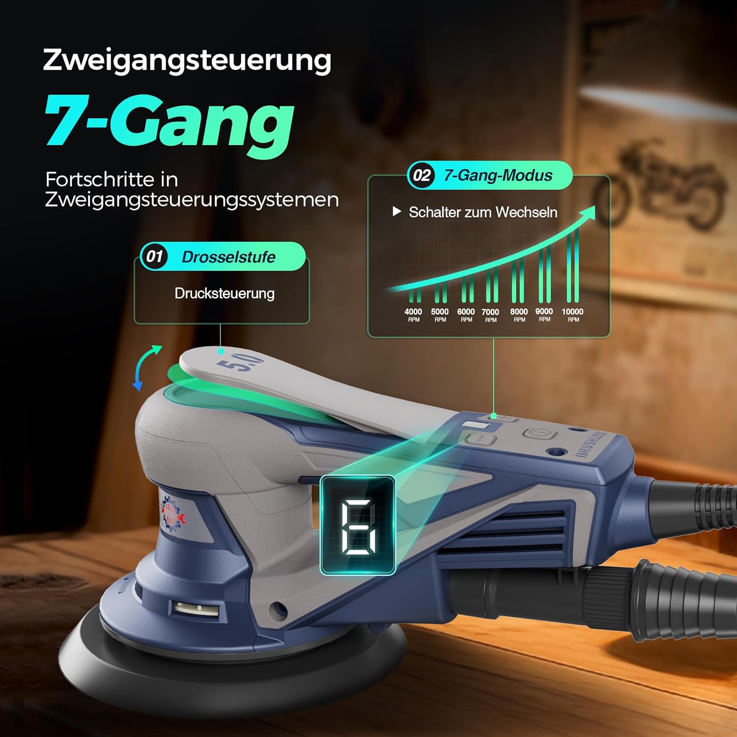 • Präzise 7-stufige Drehzahlregelung