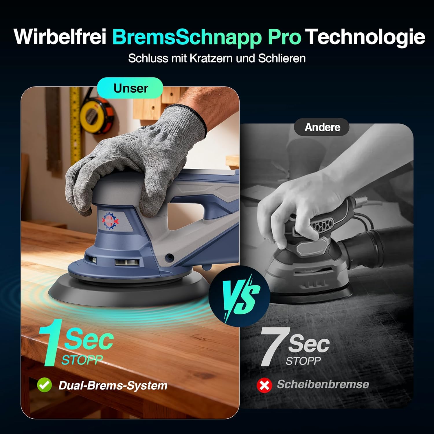 Was viele unterschätzen, ist die Bedeutung der Bremse. Oft laufen Exzenterschleifer nach dem Ausschalten ewig nach. Wenn du die Maschine dann in der Hektik zu früh absetzt, hast du sofort tiefe Krater im Werkstück. Das BrakeSnap-System löst dieses Problem effektiv: Die Maschine steht in unter einer Sekunde. Das macht den Arbeitsalltag stressfreier.
