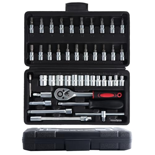 Camiraft 46 Stück Knarrenkasten Klein 1/4 Zoll Steckschlüsselsatz Ratschenkasten, Das Verchromt Werkzeugkoffer, Ratschen- und Steckschlüssel-Set Geeignet für Arbeiten an Fahrrädern Hause und DIY