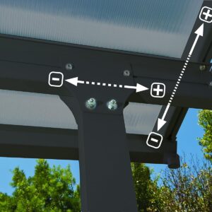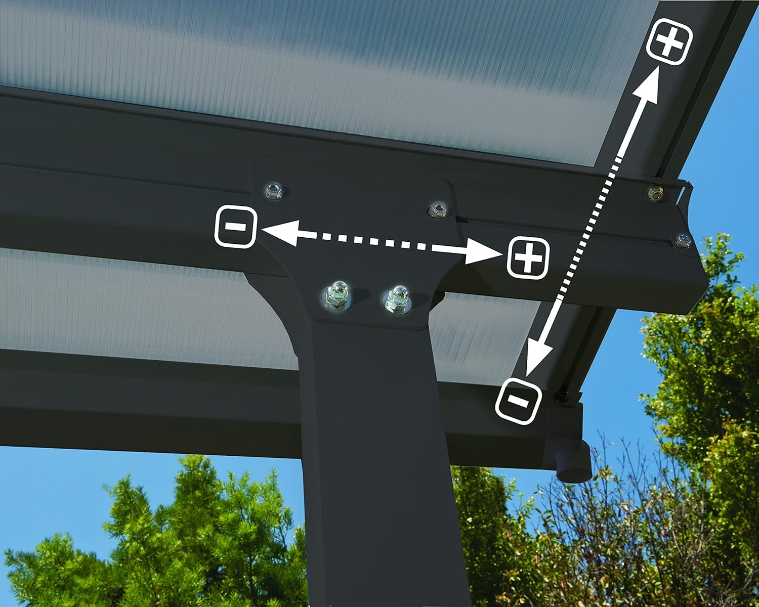 Die Feria 3 zeichnet sich durch ihre besonders langlebige Konstruktion aus hochwertigem, korrosionsfreiem Aluminium und verzinktem Stahl aus. Aufgrund dieser stabilen Materialwahl sowie der hochwertigen Verarbeitung erzielt die Überdachung in Nutzerbewertungen solide 4,2 von 5 Sternen.