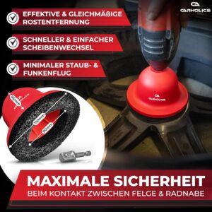 Mit dem CARHOLICS Radnabenschleifer Auto entfällt das mühsame händische Schleifen mit der Drahtbürste. Durch das durchdachte Design mit 90 mm Innendurchmesser gleitet der Schleifer sicher über die Radnabe. Das offenporige Schleifvlies greift den Rost gezielt an und bereitet das Metall darauf vor, wieder glatt und eben zu sein. Dies ist entscheidend für den korrekten Sitz der Felge, was wiederum Vibrationen verhindert.