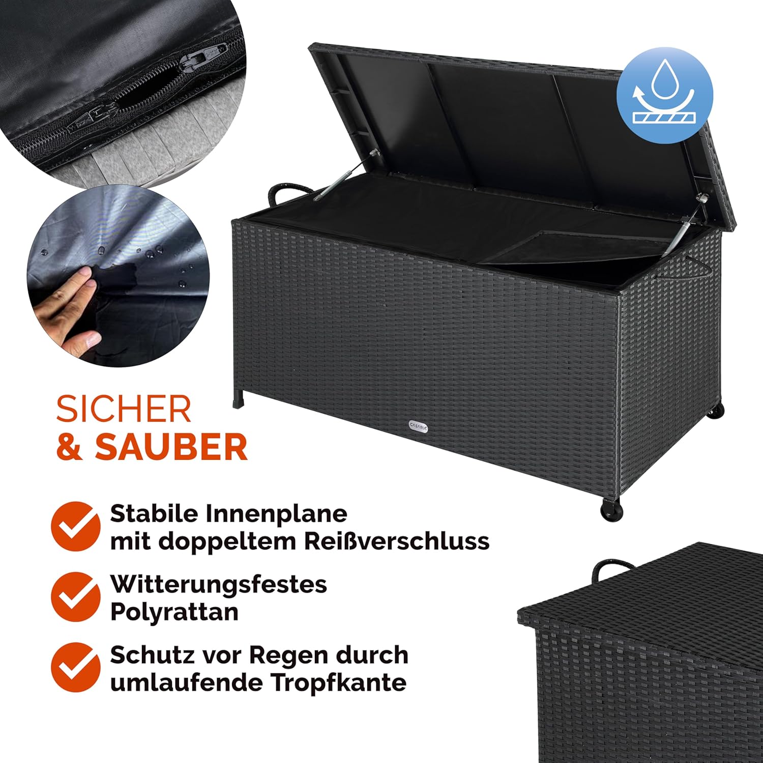 Die Casaria Box ist mit einer wasserabweisenden Innenverkleidung aus Polyester ausgestattet, die du per Klett befestigst. In der Praxis hält das den Regen und Schmutz draußen, aber achte darauf, dass der Reißverschluss der Innenfolie sauber schließt – das macht den Unterschied, ob deine Kissen trocken bleiben oder nicht.