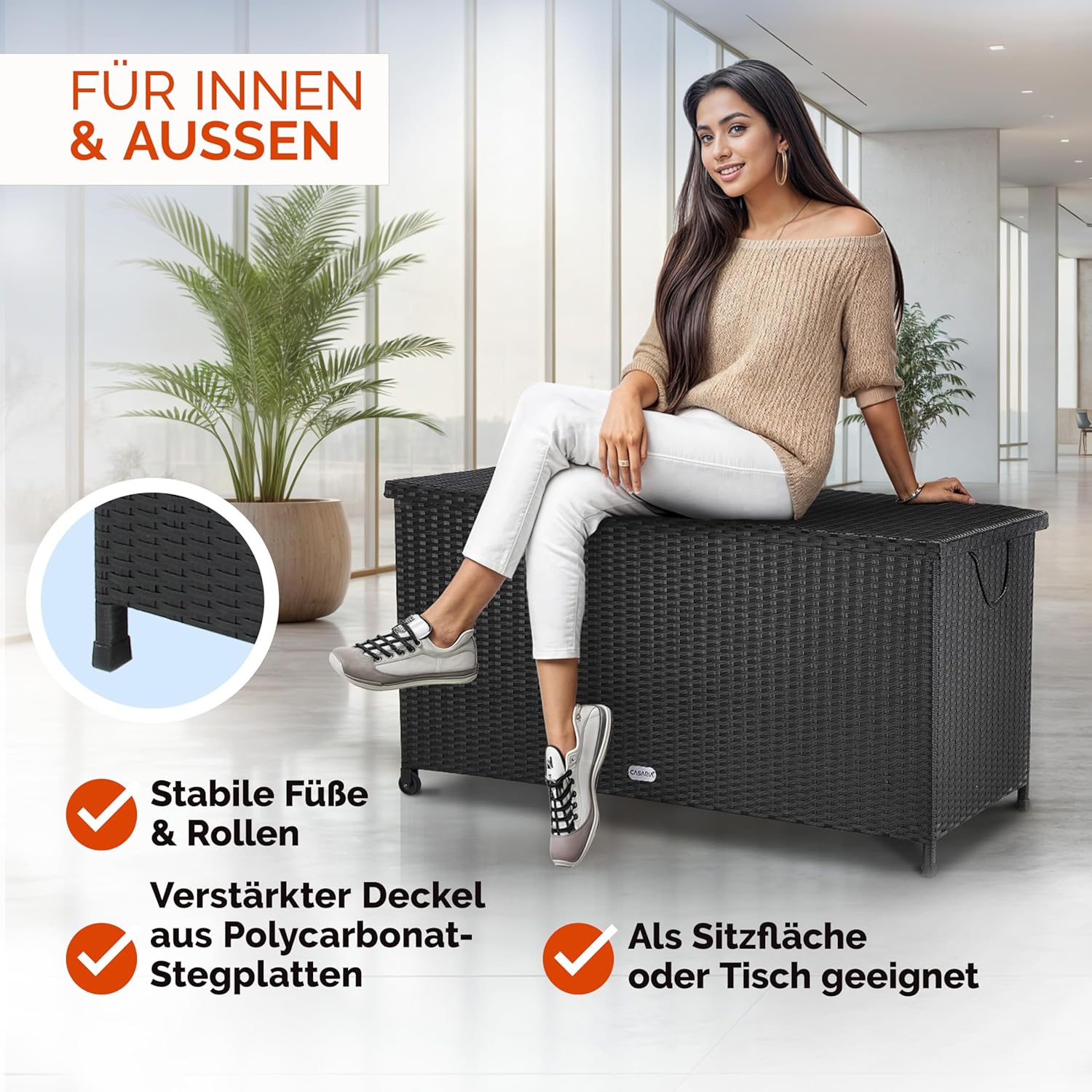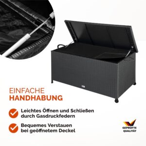 - Belastbarkeit von 160kg: Dank der Metall-Verstärkungsstreben im Deckel hält die Box punktueller Belastung stand und dient als vollwertige Sitzbank.