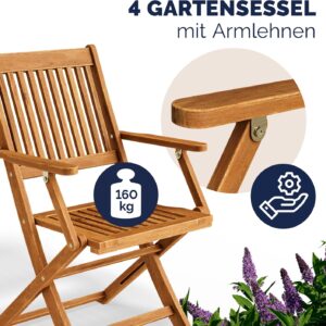 Das 5-teilige Set von Casaria bietet eine flexible Sitzlösung für bis zu 4 Personen. Es besteht aus vier Stühlen mit Armlehnen und einem passenden Tisch, was es ideal für gemeinsame Mahlzeiten oder gesellige Runden macht.