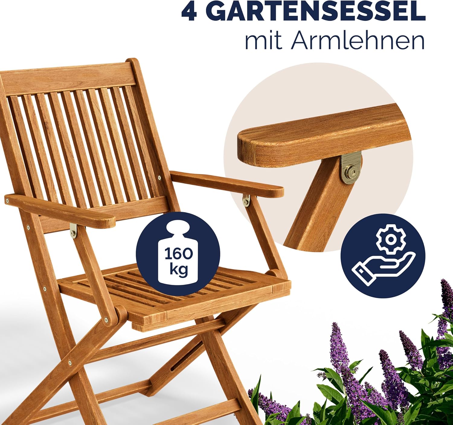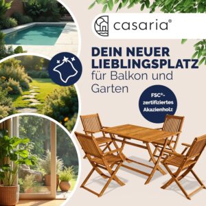 Das Casaria® Gartenmöbel Set Wetterfest Klappbar überzeugt durch seinen durchdachten Aufbau aus massivem Akazienholz. Die 5-teilige Konstruktion besteht aus vier stabilen Stühlen und einem kompakten Tisch. Unser Team hat die Mechanik der Klappverbindungen unter die Lupe genommen und festgestellt, dass die Gelenke präzise gefertigt sind, was das Auf- und Zuklappen ohne Verklemmen ermöglicht.