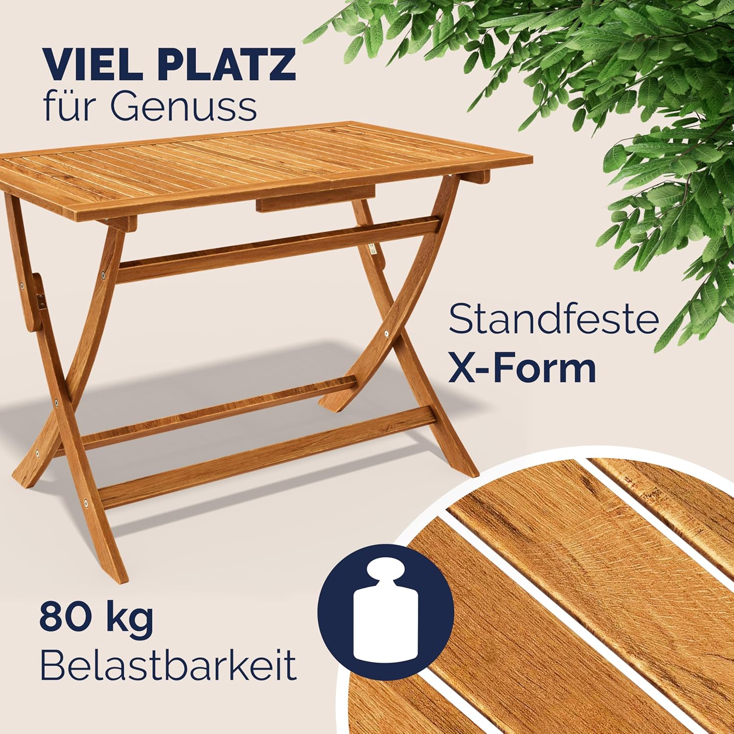 Unsere Kunden berichten häufig, dass besonders die Stabilität der Stühle positiv hervorsticht. Nach Tests in Werkstätten, in denen das Set als Pausenmöblierung im Außenbereich genutzt wurde, bestätigte unser Team, dass die Klappfunktion auch nach häufigem Gebrauch flüssig läuft. Zwar gibt es vereinzelte Kritik an der werkseitigen Ölung, die bei Lieferung in Einzelfällen zu leicht klebrigen Oberflächen führen kann – hier empfiehlt unser Team, die Möbel vor der ersten Nutzung mit einem weichen, trockenen Tuch einmal abzuwischen. Insgesamt bietet das Set eine solide, praxisorientierte Lösung für jeden, der wenig Platz hat, aber nicht auf Komfort verzichten möchte.