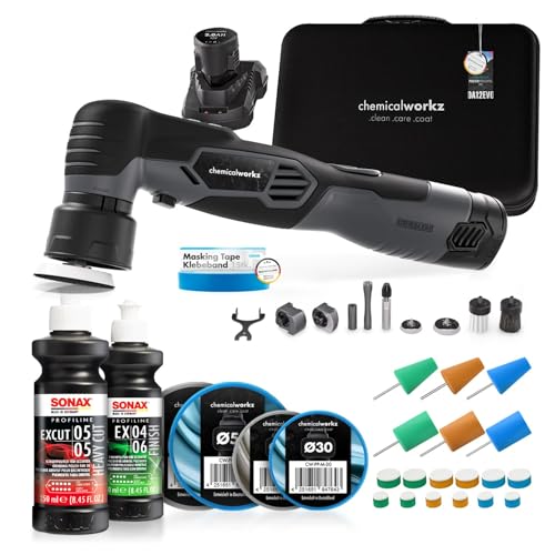 chemicalworkz EVO Mini Akku Poliermaschine 25-teiliges Set I Exzenter & Rotation I mit Akkus Adaptern Stütztellern Pads Sonax-Polituren und Zubehörchemicalworkz EVO Mini Akku Poliermaschine 25-teiliges Set I Exzenter & Rotation I mit Akkus Adaptern Stütztellern Pads Sonax-Polituren und Zubehör
