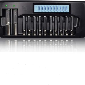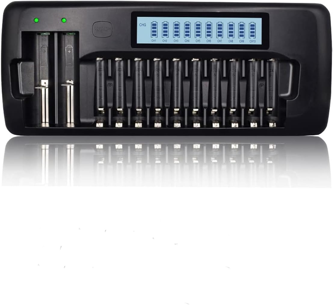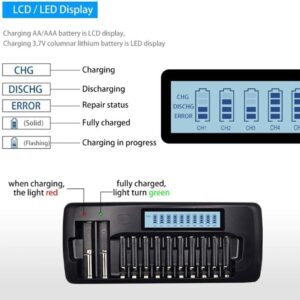 - Das 10-fache AA AAA LCD-Ladegerät bietet 10 verschiedene Kanäle, mit denen Sie jede Kombination von 1-10 Stück AA/AAA NIMH/NICD-Akkus aufladen können; das 2-fache LED-Ladegerät kann gleichzeitig 1-2 Stück 3,7V 18650 20700 26650 13450 14500 16340 (RCR123) Li-Ion-Akkus aufladen.