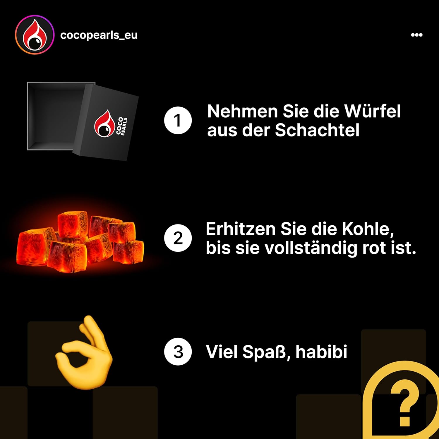 • Lagerung: Unbedingt trocken lagern. Selbst geringe Feuchtigkeit im Karton führt dazu, dass die Kohle beim Anzünden sprüht oder sich schwer entzünden lässt.