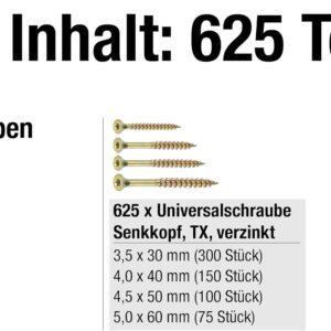 Das Connex Universalschrauben-Sortiment enthält Schrauben in unterschiedlichen Größen, sowohl als Voll- als auch als Teilgewinde-Ausführung. Die genaue Größenstaffelung ist auf die gängigsten Holzverbindungen im Haus-, Hobby- und Werkstattbereich abgestimmt. Mit 625 Teilen bietet das Set eine praktische Grundausstattung für vielfältige Verschraubungsarbeiten.