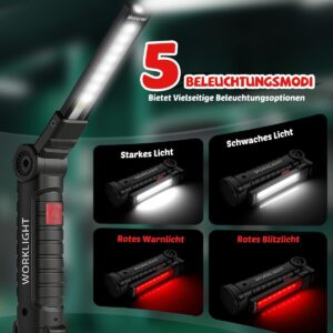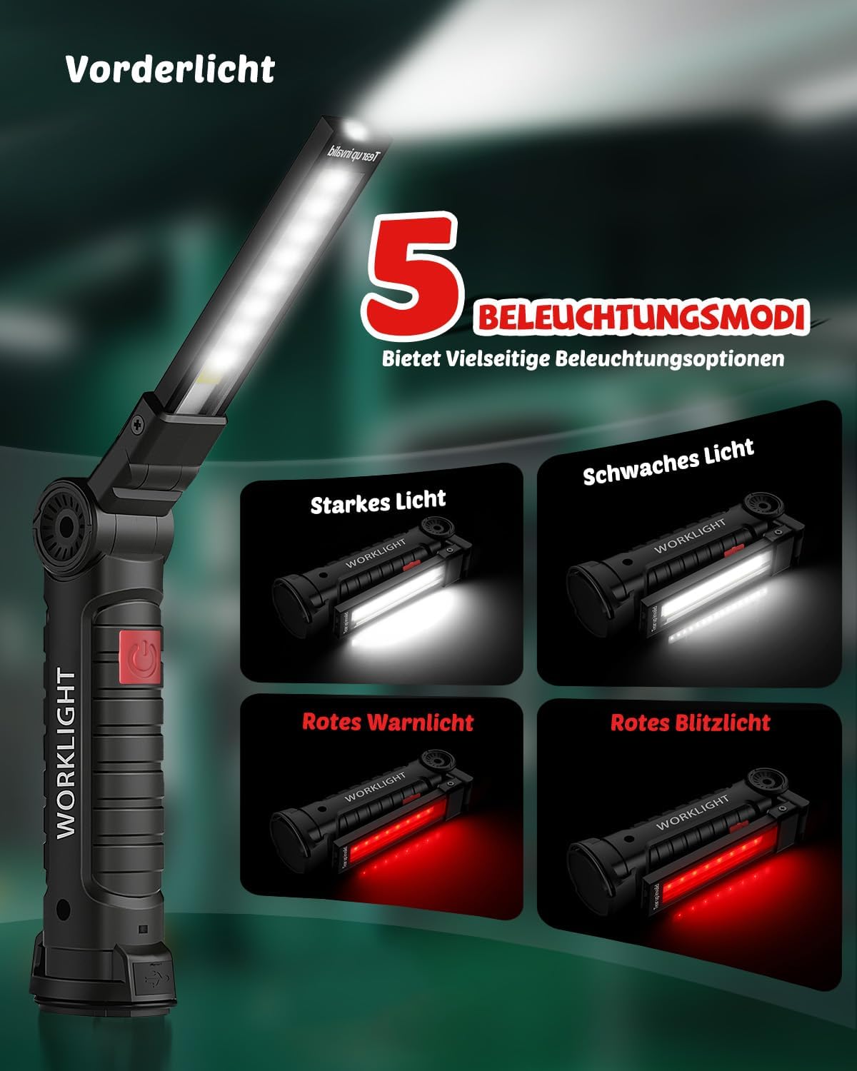 Die Lampe zeichnet sich durch ein einzigartiges 360-Grad-Rotationsdesign aus. Dadurch bietet sie eine Beleuchtung aus verschiedensten Winkeln, was sie besonders praktisch für Arbeiten an engen oder schwer zugänglichen Stellen in der Werkstatt macht.