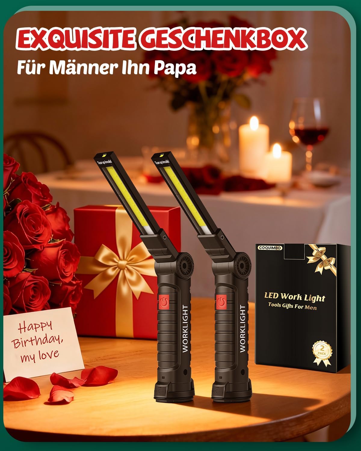 Die Coquimbo Geschenke für Männer Werkstattlampe ist das ideale Equipment für Heimwerker, Mechaniker und Outdoor-Enthusiasten, die bei Reparatur- und Wartungsarbeiten auf eine präzise Ausleuchtung angewiesen sind. Mit ihrem klappbaren und magnetischen Design bietet diese LED-Arbeitsleuchte maximale Flexibilität, um auch in engsten Motorräumen oder dunklen Arbeitsecken für volle Sicht zu sorgen. Das praktische 2er-Set ist die perfekte Ausstattung für Werkstatt, Garage oder das nächste Camping-Abenteuer.