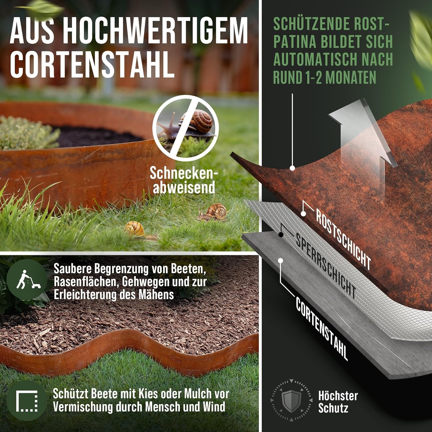 - Natürlicher Schneckenschutz: Der hohe Kupferanteil im Cortenstahl bildet eine Patina, die Schnecken zuverlässig abweist – deine Pflanzen bleiben ungestört