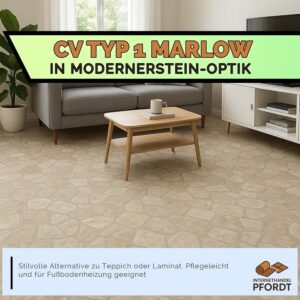 Der CV Bodenbelag Marlow Stein Optik bietet eine ideale Lösung für Heimwerker und Renovierer, die eine fachgerechte und ästhetische Bodengestaltung in Wohn- oder Arbeitsbereichen suchen. Durch die einfache Verlegung und robuste Oberfläche ist er perfekt geeignet, um Räume schnell optisch aufzuwerten und gleichzeitig pflegeleicht zu halten.