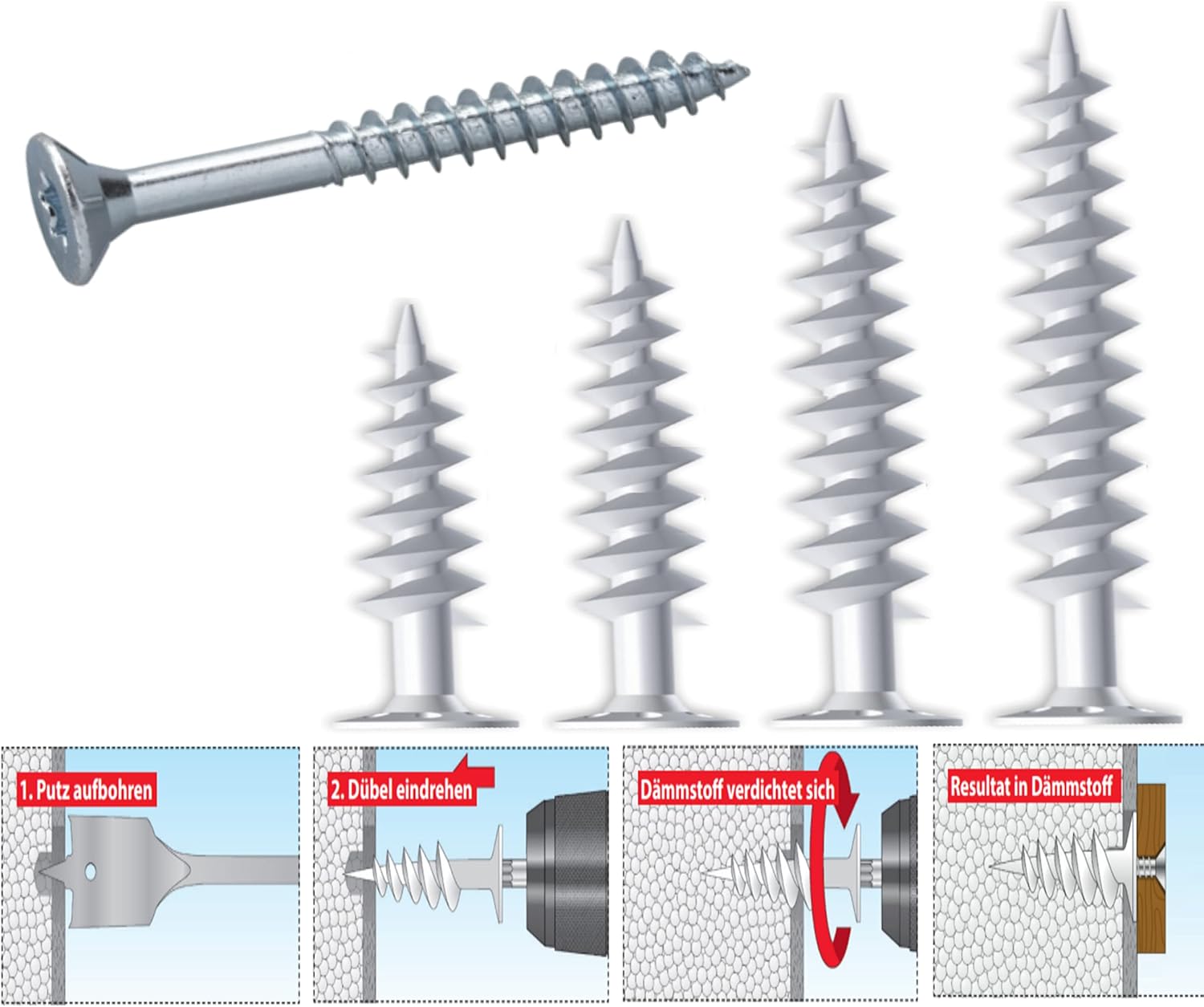 - Direktmontage ohne Vorbohren: Das patentierte Design erlaubt das direkte Eindrehen in viele Dämmstoffe, was wertvolle Arbeitszeit auf der Baustelle spart.