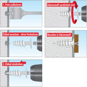 Bei Verwendung spezieller Dämmstoffdübel ist ein Bohren oder die Nutzung von Spezialwerkzeug nicht notwendig, da die Dübel direkt in den Dämmstoff eingedreht werden können. Dies ist besonders vorteilhaft, um die Fassadenstruktur nicht zu beschädigen und Wärmebrücken effektiv vorzubeugen. Mit einer Bewertung von 4,3 Sternen bietet diese Lösung eine zuverlässige und effiziente Methode für schnelle Befestigungen.
