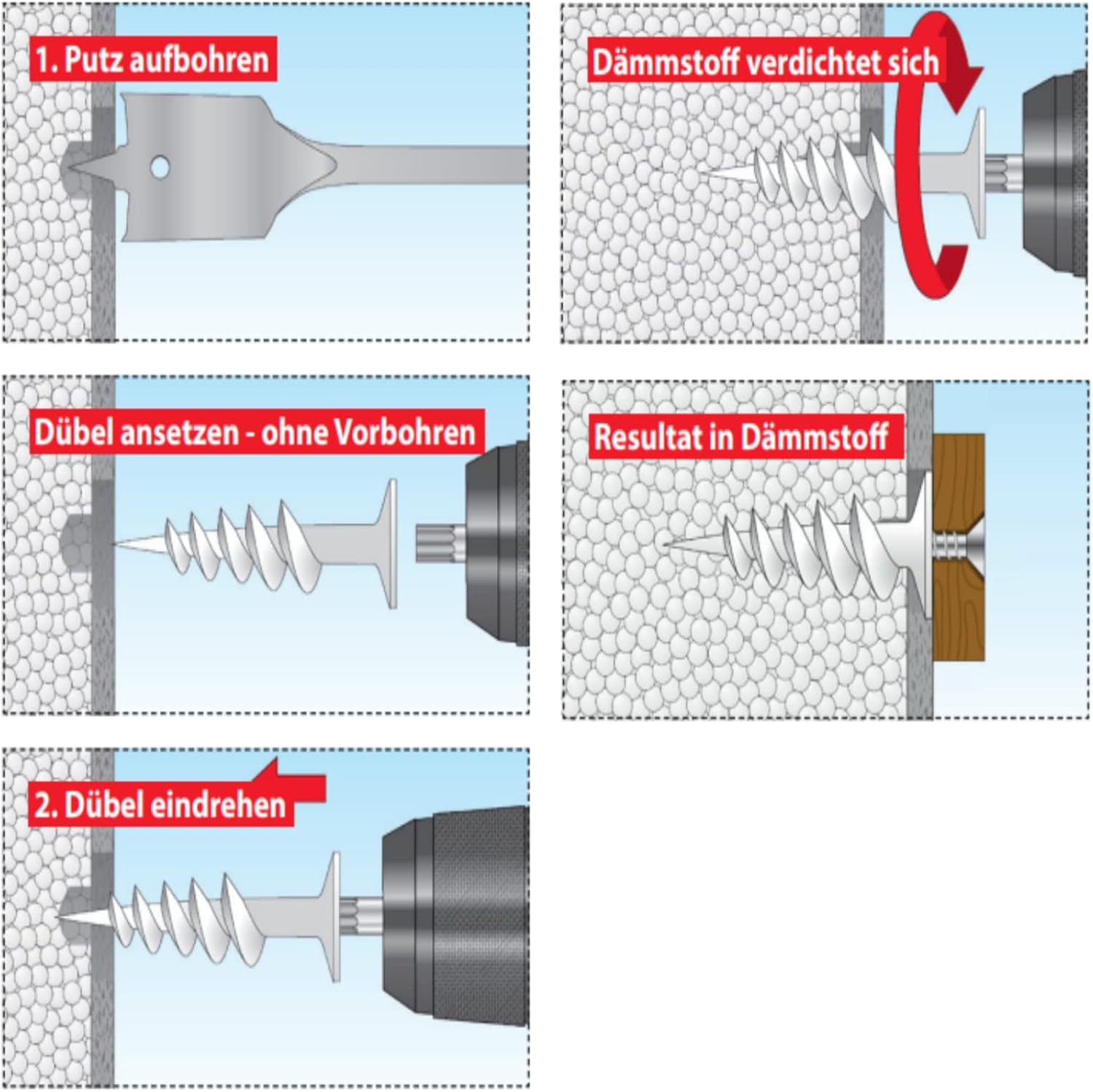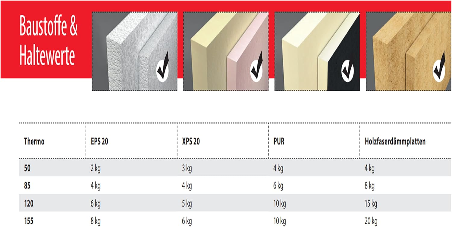 - Bei Holzfaser-Dämmstoffen bitte immer mit einem Bohrer auf 6 mm vorbohren, um ein Ausbrechen des Materials zu verhindern.