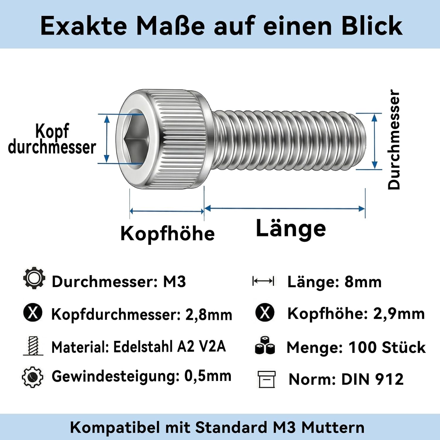 Das ist der absolute Standard für Kleinteile. Mit einem Gewindedurchmesser von 3 mm und einer Länge von 8 mm passt das Set perfekt, wenn du Bauteile präzise verschrauben willst, ohne dass der Kopf übersteht. In der Praxis zeigt sich oft, dass die Kombination mit dem beiliegenden 2,5 mm Schlüssel genau das ist, was man beim Schrauben an Elektronik oder kleinen Gehäusen braucht.