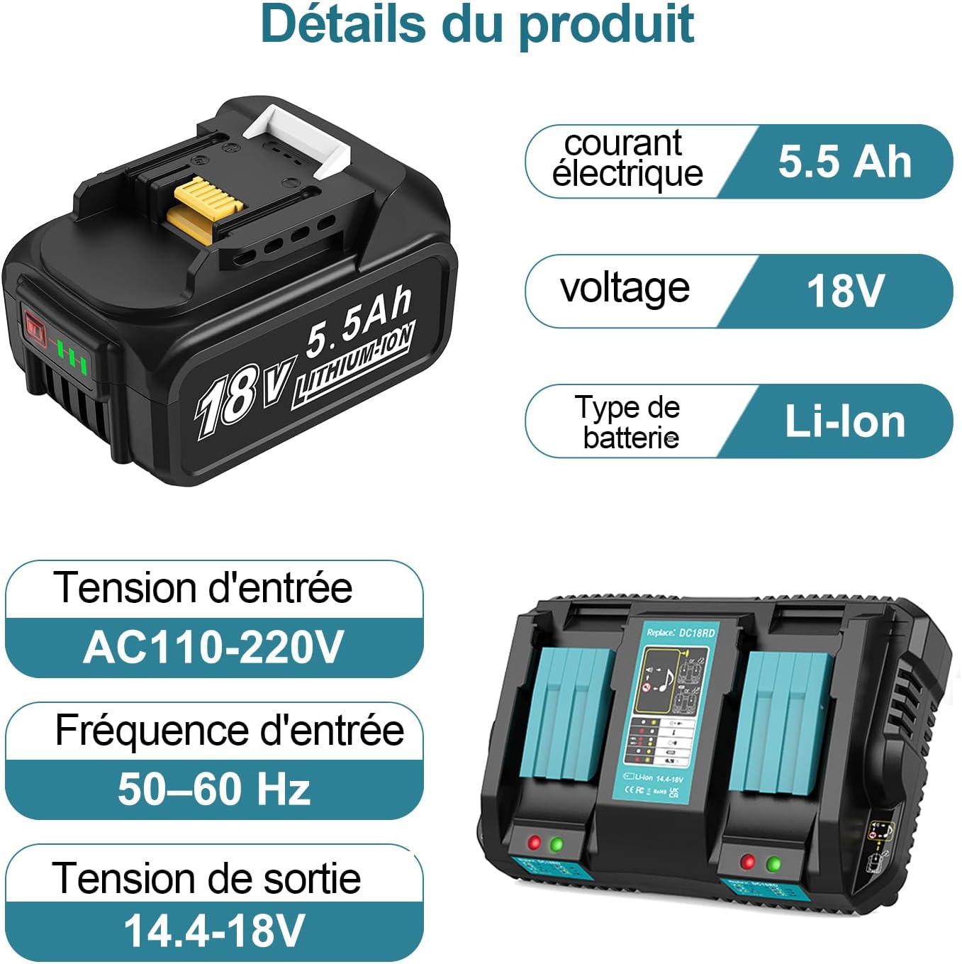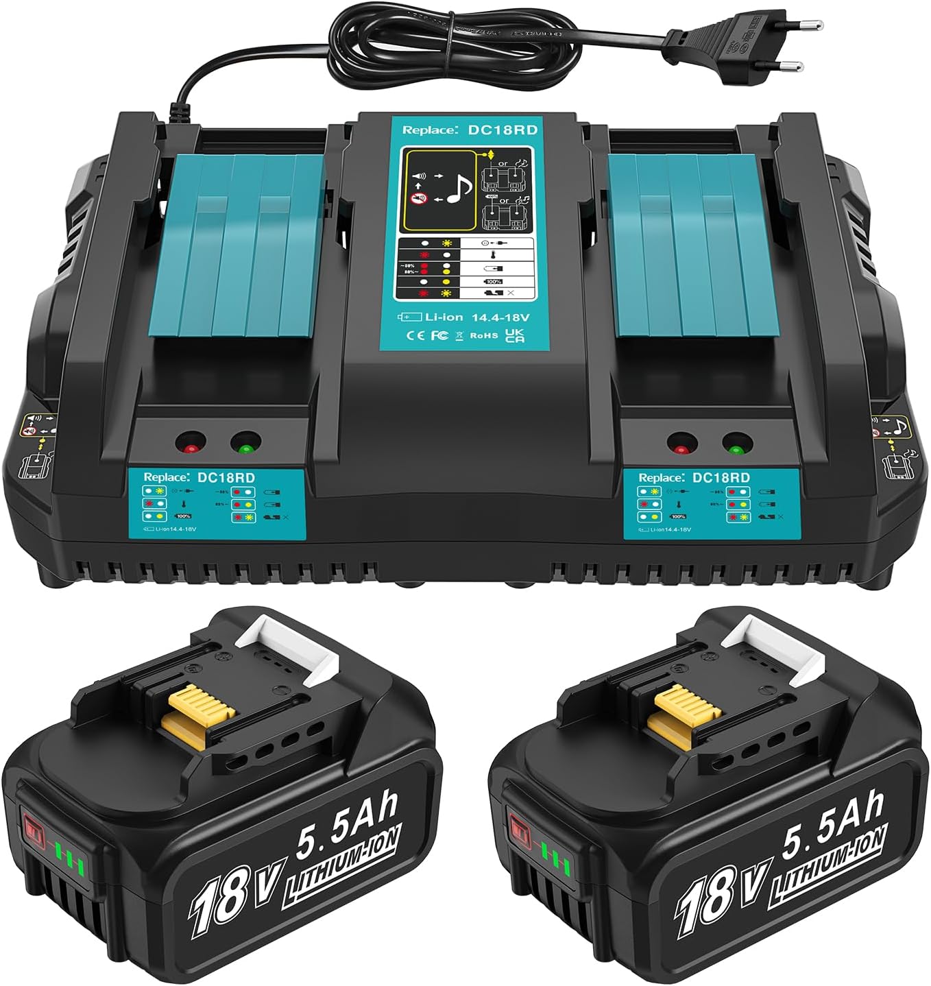 Produktbeschreibung für DC18RD 18V Ladegerät + 2 Stück
