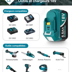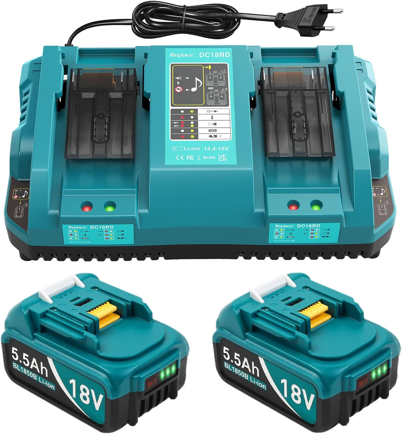 DC18RD Ladegeräte und 2 Stücke 5.5Ah Ersatzakkus für Makita 18V Akkus, Kompatibel mit BL1815 BL1830 BL1840 BL1850 BL1860 BL1890 BL1415 BL1430 BL1440DC18RD Ladegeräte und 2 Stücke 5.5Ah Ersatzakkus für Makita 18V Akkus, Kompatibel mit BL1815 BL1830 BL1840 BL1850 BL1860 BL1890 BL1415 BL1430 BL1440