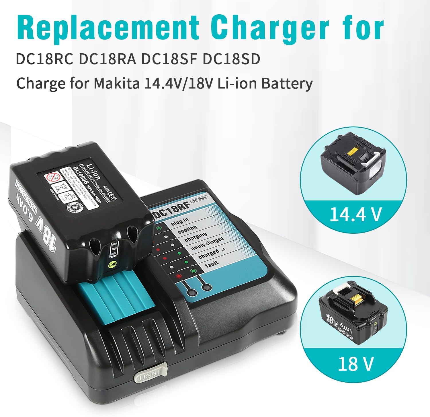 DC18RF Ladegerät-Set mit 18V 5.0Ah Akku für Makita BL1860B BL1860 BL1850 BL1840 mit LED-LadeanzeigeDC18RF Ladegerät-Set mit 18V 5.0Ah Akku für Makita BL1860B BL1860 BL1850 BL1840 mit LED-Ladeanzeige