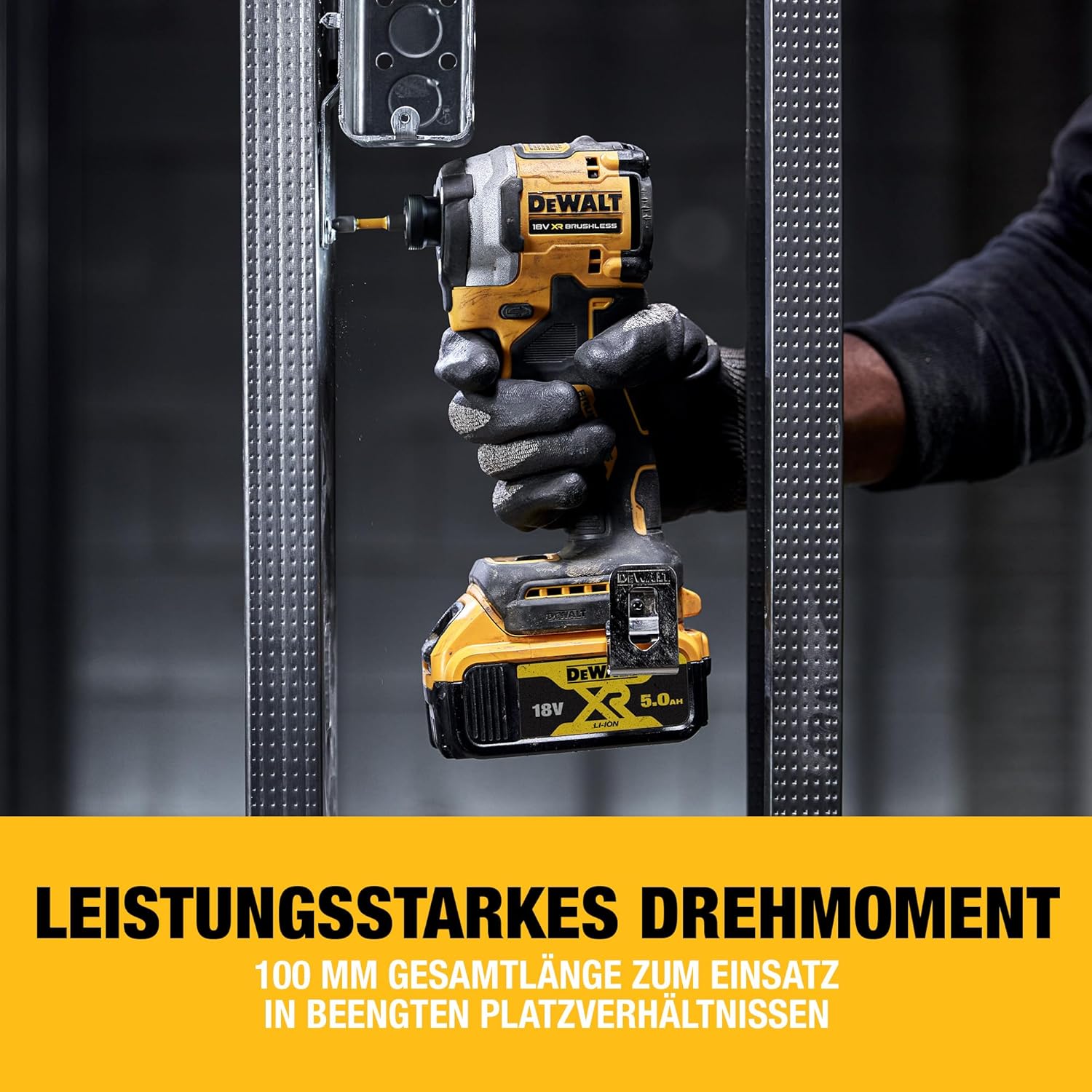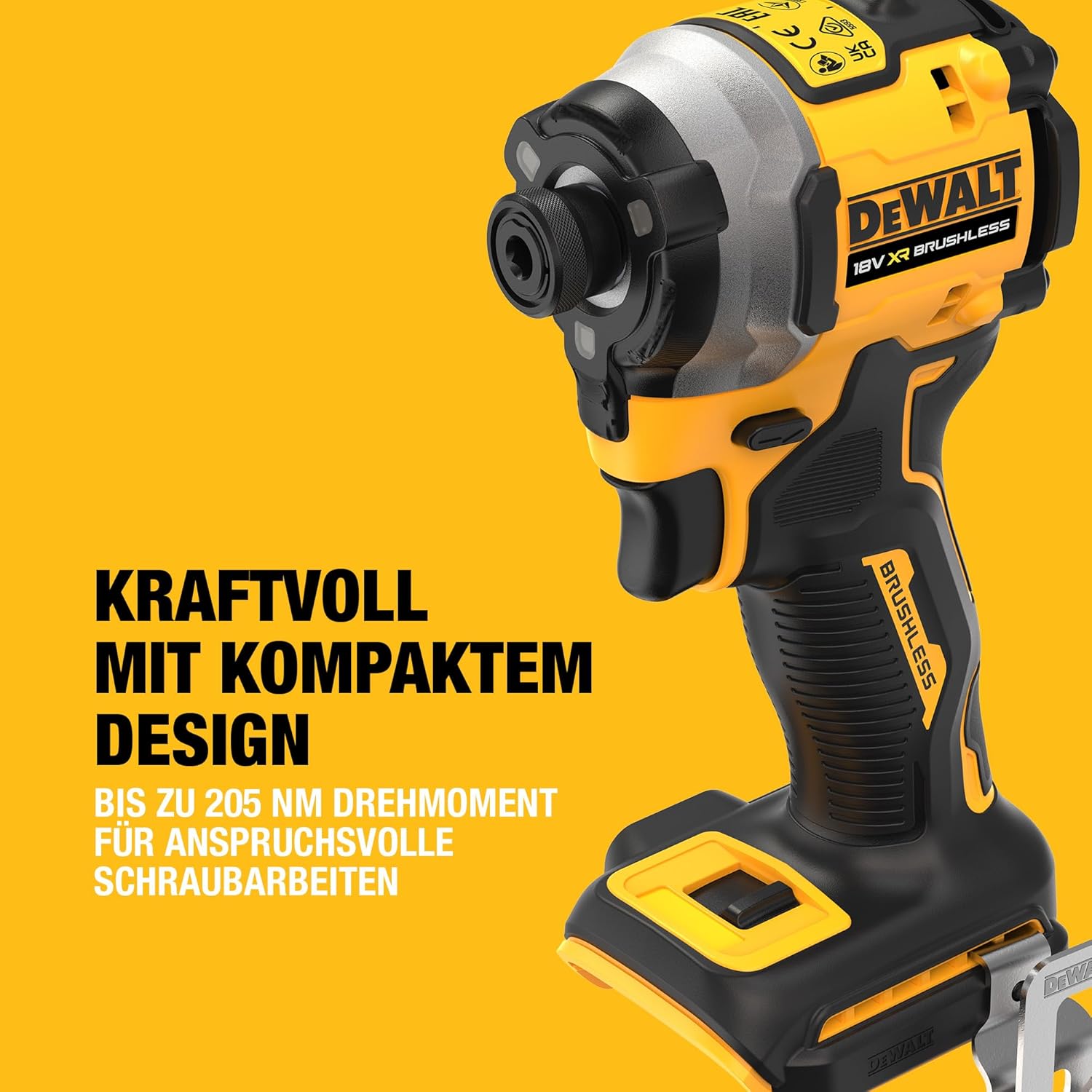 Der DEWALT 18V Akku-Schlagschrauber liefert ein kraftvolles Drehmoment von bis zu 205 Nm. Diese Leistung ermöglicht müheloses Arbeiten auch bei schweren Schraubarbeiten und anspruchsvollen Anwendungen. Dank des bürstenlosen Motors wird die Kraft besonders effizient übertragen.