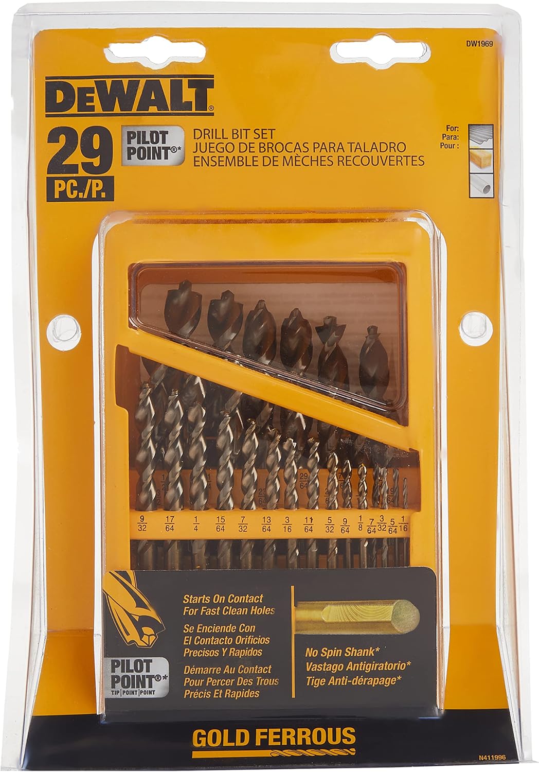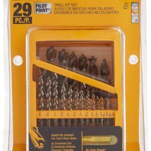 29-teiliges Pilotpunkt-Set, Metall-Index-Pilotpunkt-Spitze beginnt bei Kontakt für saubere, genaue Löcher und reduziert die Verriegelung beim Durchbruch, kein Schleuderschaft eliminiert das Drehen des Bits im Bohrfutter, konische Bahn bietet längere Haltbarkeit, um Bruchgrößenmarkierungen befinden sich über dem Schaft, um zu verhindern, dass sie beim Bohren in Holz, Metall und Kunststoff abgenutzt werden. Komponenten umfassen: Split-Punkt-Bohrer in den Größen 1/16 Zoll, 5/162 Zoll. 0,25 Zoll, 3
