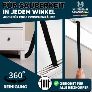 Die Original Heizkörperbürste von MEISTERSTARK verfügt über eine Gesamtlänge von 115 cm. Damit eignet sie sich hervorragend, um auch tief liegenden Staub in schwer zugänglichen Heizungszwischenräumen gründlich zu entfernen.