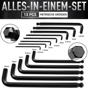 Das DISEN 13-teilige Innensechskantschlüssel-Set ist die essentielle Grundausstattung für ambitionierte Heimwerker, Mechaniker und Handwerker, die Wert auf Präzision bei der Schraubarbeit legen. Mit seinen metrischen Größen von 1,27 bis 10 mm bietet es maximale Vielseitigkeit, um verschiedenste Inbusschrauben an Maschinen, Fahrrädern oder Möbeln mühelos zu lösen oder festzuziehen.