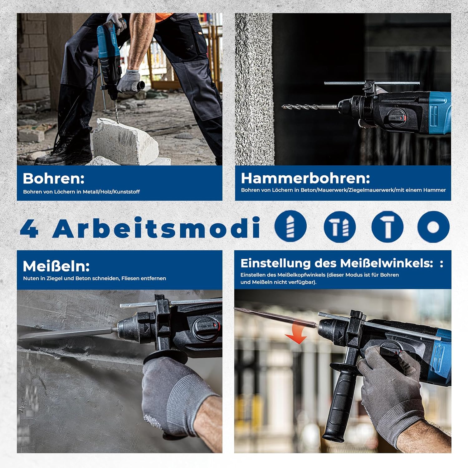 | Funktionen | 4-in-1 (Bohrhammer, Bohrmaschine, Meißel, Abbruchhammer) |